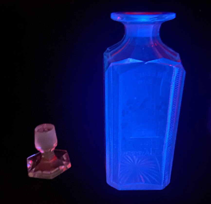 The Cork Glass Company decanter (1986-61-138) glows blue under shortwave UV illumination.