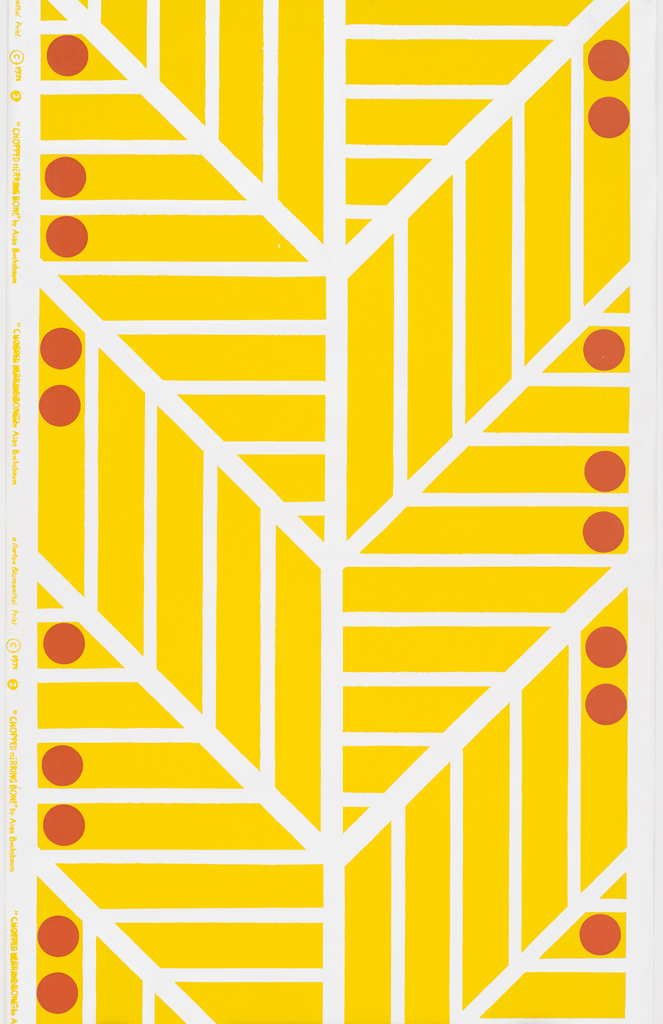 “Aptly titled Life Savers, this wallcovering enlivened the interiors market sometime in the early 1970s. The design consists of circles, or life savers if you will, tightly aligned in polka dot fashion. The front of each circle is printed in an intense yellow, with slightly lighter yellow sides, which visually creates relief. . . . Alan Buchsbaum was an architect and designer, whose career took him through the supergraphics look of the 1960s (he is said to be one of the originators of this style), to the high-tech aesthetic of the 1970s, and the loft look popular during the 1980s.”