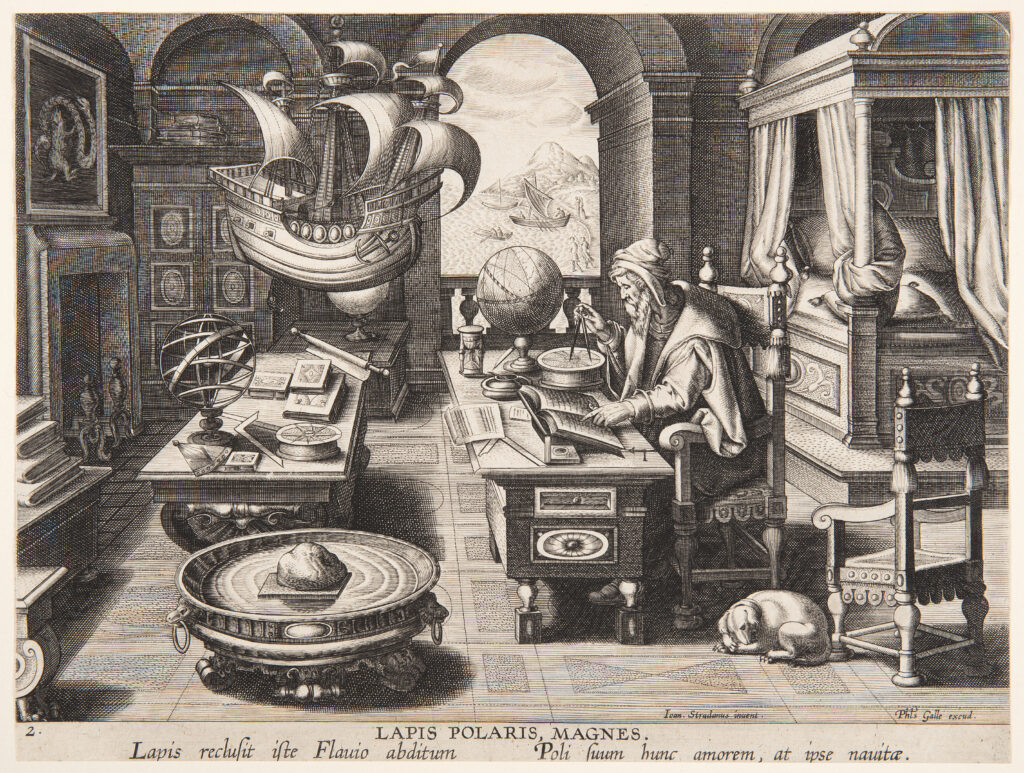 Figure 2: Print, Lapis Polaris Magnes (Invention of the Compass), ca. 1590; After Jan van der Straet, called Stradanus (Flemish, 1523–1605); Published by Philips Galle (Dutch, 1537–1612); Engraving on paper; 20 × 26.8 cm (7 7/8 × 10 9/16 in.); Museum purchase through gift of Samuel P. Avery, 1947-26-1