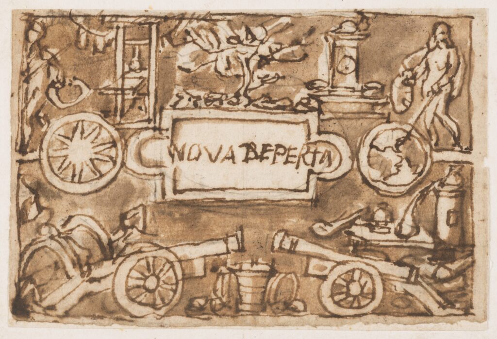 Figure 3: Drawing, Title Page, ca. 1590; Jan van der Straet, called Stradanus (Flemish, 1523–1605); Pen and brown ink, brush and brown and black wash over black chalk on laid paper; 7.1 × 10.7 cm (2 13/16 × 4 3/16 in.); Museum purchase through gift of various donors, 1901-39-149