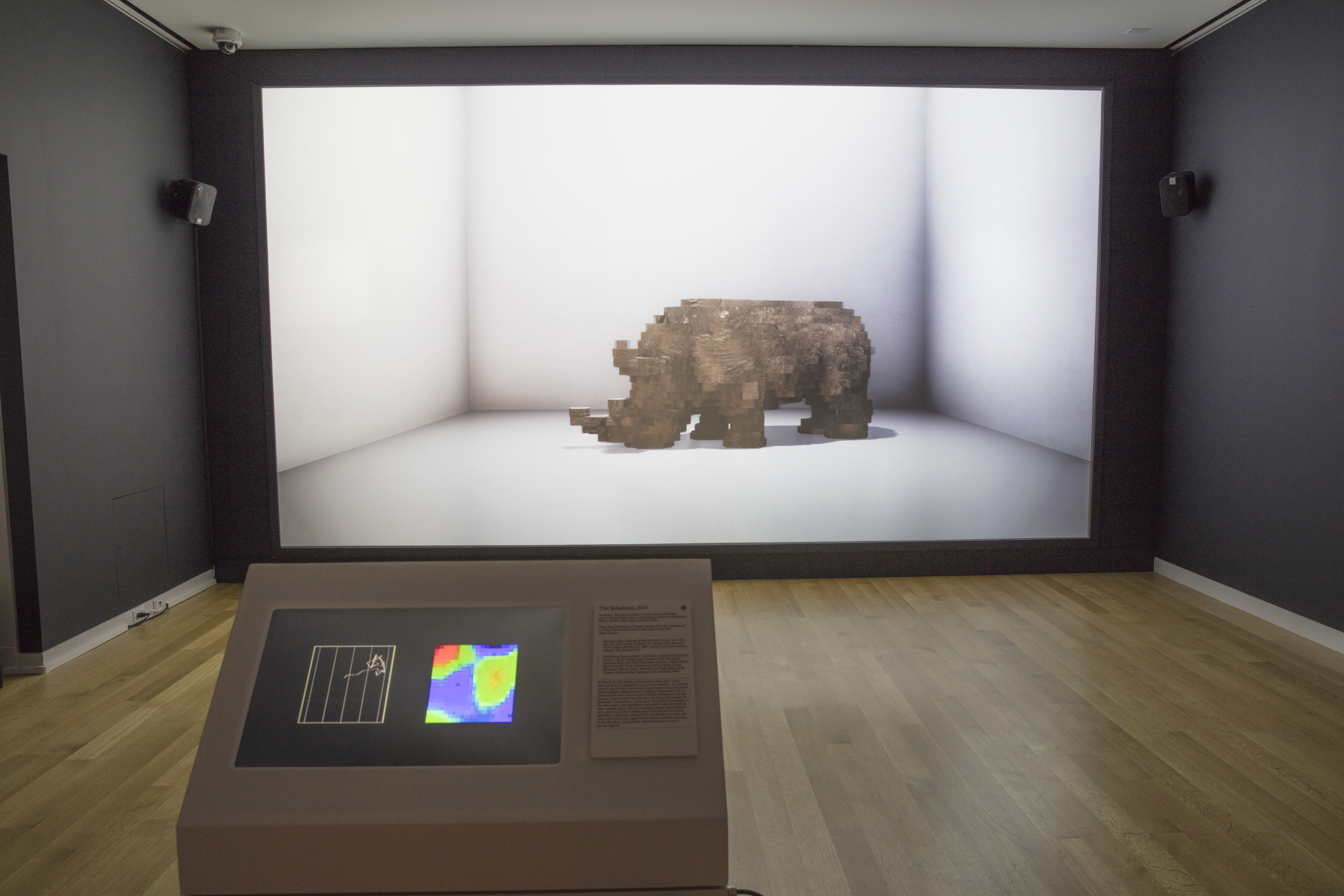 On March 19, 2018, the last male northern white rhino, Sudan, died, bringing his subspecies to the brink of extinction. Scientists extracted Sudan’s DNA, stored it in lab freezers, and proposed experimental de-extinction projects using his genetic material. In this context, Ginsberg created The Substitute, digitally resurrecting a northern white rhino. This artificial rhino is divorced from the natural habitat where its living counterparts once roamed. Confined to a virtual white room, it is unaware of its surroundings. It appears highly pixelated and distorted. Using data generated by AI, the rhino learns to navigate the room. Its form is generated using CGI, and its sounds are adapted from rare archival footage of the last herd of northern white rhinos.