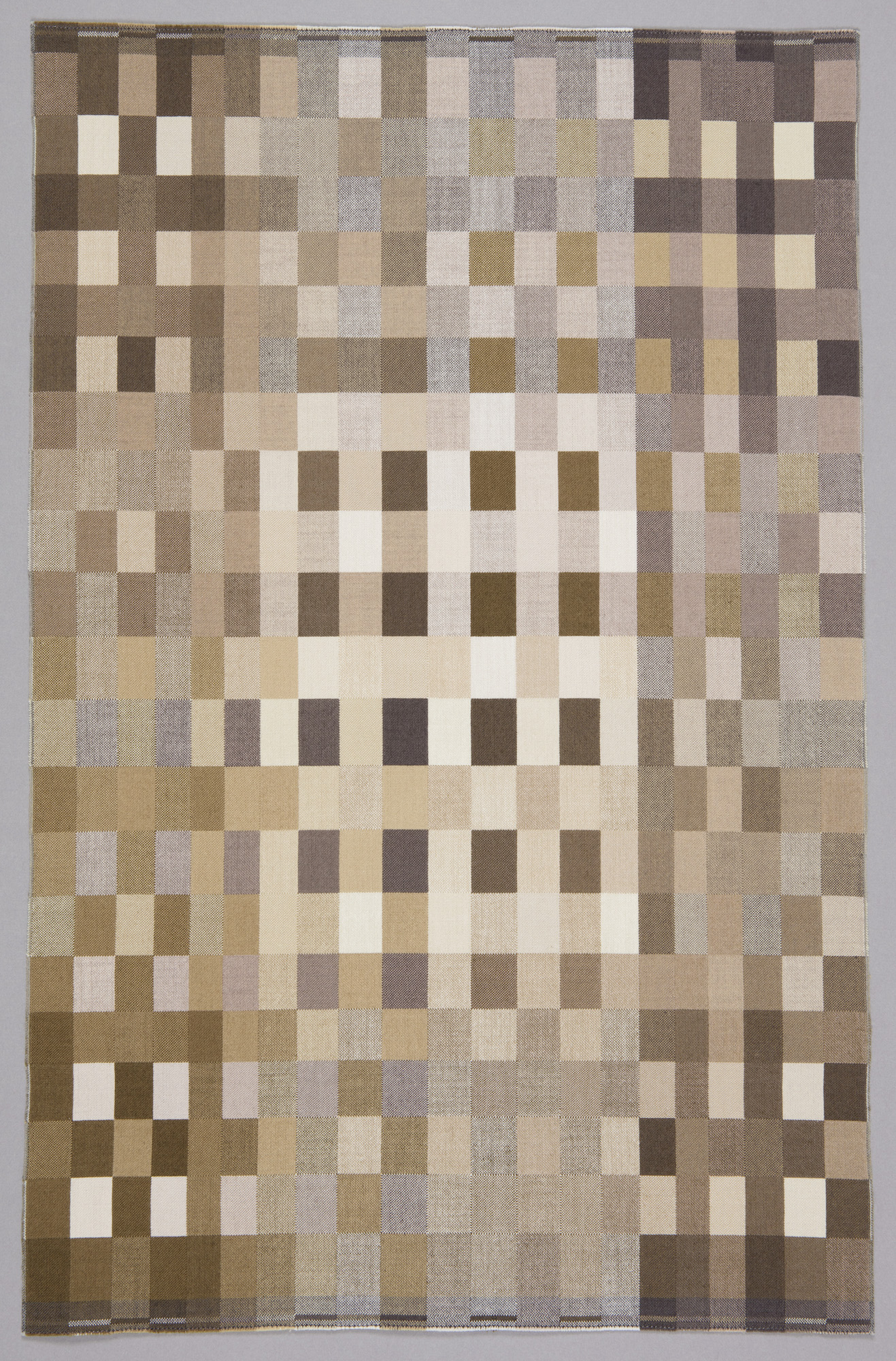 Richard Landis (American, born 1931) is a master weaver who pursued a nearly lifelong investigation of pattern and color. His double-cloth textiles are complex systems of closely related full-tones and half-tones of color, organized into abstract geometries of endless variation. In Landis’s weavings, small, medium, and large rectangles and squares repeat in ever-changing order, and every possible color combination is played out both horizontally and vertically. What appears to be a random arrangement of colored squares is a balanced and controlled expression of a well-modulated palette.
