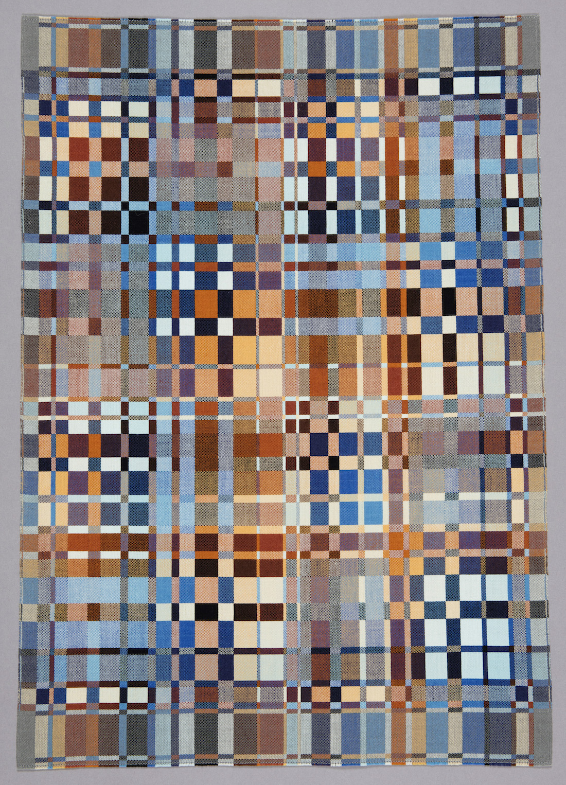Color Decoded: The Textiles of Richard Landis celebrates the recent acquisition of six of Landis’s most important works for Cooper Hewitt’s collection, installed together with three process drawings and 13 more of Landis’s textiles, and all produced between 1967 and 1995. The drawings demonstrate how Landis would calculate and visualize every permutation possible within a defined set of colors. While the actual weaving could be completed in days, it sometimes took Landis a month or more to work out the full range of tones and hues on paper, design the geometric pattern, and prepare the loom to weave the cloth. Using his preferred weave structure—double-cloth—Landis would simultaneously weave two parallel planes of fabric, a technique that allowed for the creation of the multicolored complex patterning of his textiles. The remarkable intricacy, dynamism, and luminosity found in works such as Campo di Fiori (1976), Untitled (1982), and Nines (1995) show a designer working at the height of his creative powers.