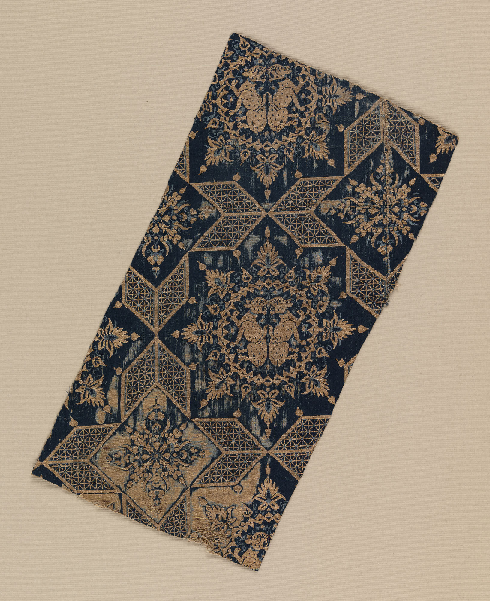 This Spanish textile features confronted leopards or cheetahs within a geometric framework, an enduring motif that probably originated in early Islamic Egypt or Persia. Woven in the 15th century by Islamic weavers, this silk lampas may have been produced in Almería, a center of silk production in Andalucía and a source of blue and gold...